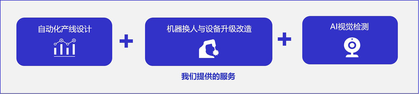 鴻富華提供自動化生產線設計、機器換人與設備智能化升級改造、AI視覺檢測服務。幫助企業合理的規劃生產線,實現生產高效、產線穩定、人機搭配合理、避免投資風險、操作維護標準化的目的。同時,通過自動化(含AI視覺檢測設備)導入,取代或輔助操作高頻重復及簡單、低效率、高人力成本、高體力勞動、高風險發生、高品質異常、高精度要求、人力檢測所難以觸及的生產與檢測環節,以提升生產效率、生產安全性、產品品質,緩解工人勞動強度,降低整體成本。其中,通過設備的智能化升級改造,實現“人、機、料、法、環、測”的信息化覆蓋和數據聯通,推動經營管理各環節的更好融合,解決工廠設備信息孤島、管理職能壁壘等問題。