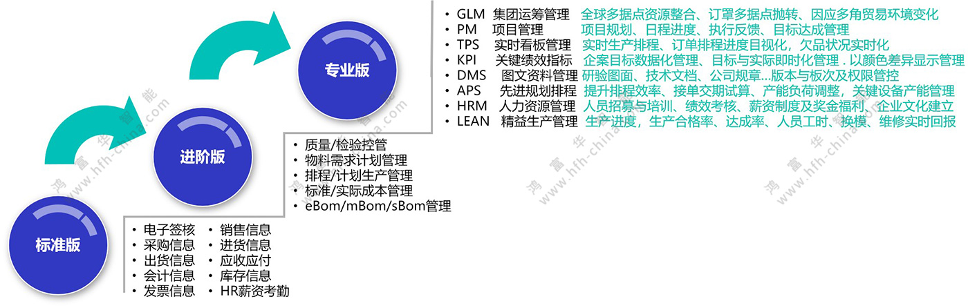 根據中小企業不同階段的發展需要,鴻富華提供可兼容擴展的標準、進階與專業版數字化管理系統,實現系統的快速、低成本升級。根據企業的需要,各模塊也可在數字化管理平臺基礎上,獨立組合及延展為MES、WMS等高階專業軟件,原有數據可實現快速的共享與導入/導出。鴻富華中小企業數字化管理平臺,既滿足企業發展初期的需要,也能兼顧企業發展中后期的升級需求。
